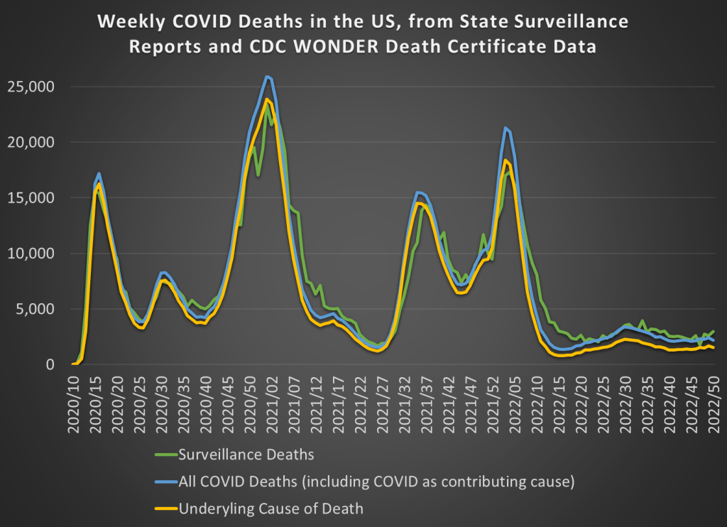But most of the data she is asking for in the op-ed is readily available. While we don’t have death totals for all individuals that tested positive for COVID-19 at some point, we do have the following data available on a weekly basis. First, we have the “surveillance data” on deaths that was released by states and aggregated by the CDC. These were “the numbers” that you probably saw constantly discussed, sometimes daily, in the media during the height of the pandemic waves. The second and third sources of COVID death data are similar to the heart disease data I discussed above, from the CDC WONDER database, separated by whether COVID was the underlying cause or whether it was one among several contributing causes (whether it was underlying or not).
