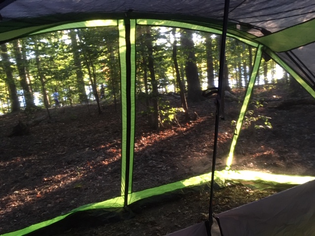 The main room is 9 x 14 ft, which is plenty big for glamor-camping (glamping) for two people. In huddled masses mode, probably 8 bodies would fit comfortably. The tent has a screen room across the front, for a bug-free place to sit. The fly over the screen room provides a roof over the door to the main room, keeping out rain even when the tent door is opened. Here are two views from within on our latest camping trip, first looking out the door through the screen room, and then looking straight up through the roof before we put the fly over the tent at the end of the day.