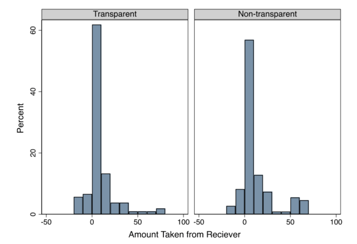 Also, there is significantly more taken in non-transparency. When the worker does not have good information on the meritocratic outcome, then some dictators feel like they can get away with taking more. Some of this happens through what we call “shading down” of the amount sent by the dictator under the cover of non-transparency.