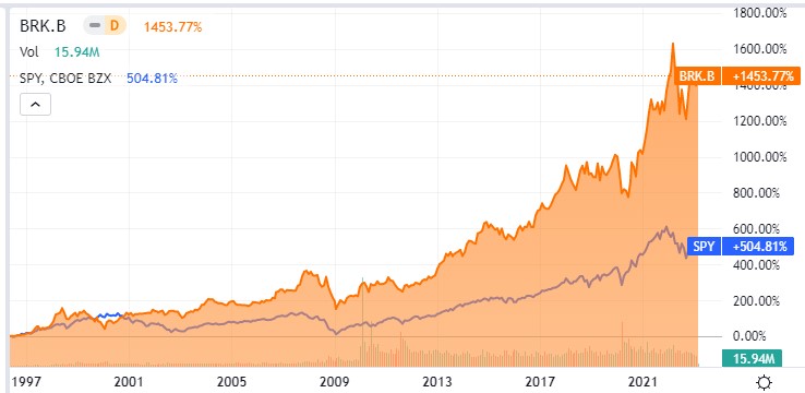 You, too, can participate in Buffett’s investing magic, by buying shares in Berkshire Hathaway. The stock symbol is BRK.B. (Disclosure: I own a few shares). Buffett has been skeptical of flashy tech stocks, and so BRK.B’s performance lagged the S&P 500 fund SPY in 2020-2021, but over the long term Berkshire (orange line in chart below) has crushed the S&P:
