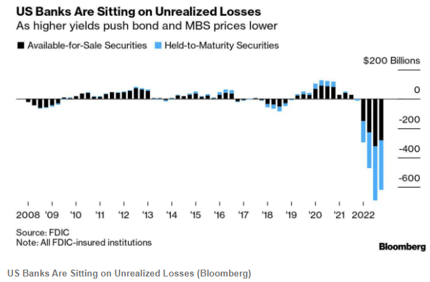Banks generally operate on the model of borrow short/lend long: they “borrow” from depositors and buy longer-term securities. Normally, short-term rates are lower than long-term rates, so banks can pay out much lower interest on their deposits than they receive on their bond/loan investments. With the Fed’s rapid increases in short-term rates this past year, however, the rate curve is heavily inverted, which is disastrous for borrow short/lend long. Fortunately for banks, many depositors are too lazy to do what I have done, which is to move most of my immediate-need money out of bank accounts (paying maybe 1%) and into T-bills and money market funds paying 4-5%.