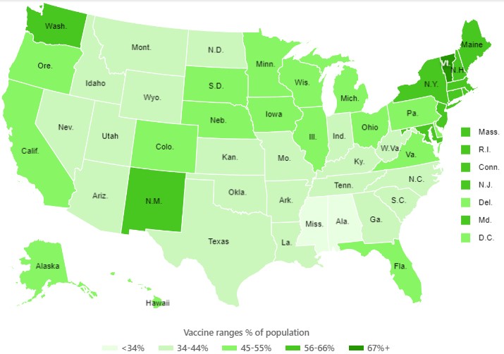 Also, I have shuttled back and forth between northern Virginia (very blue) and Alabama (very red) in the past two years. Whether or not formal lockdowns or mask mandates were in force, I saw much more mask-wearing in northern Virginia, compared to Alabama. I suspect this reflected overall attitudes and behaviors regarding social distancing. Not saying one is right and one is wrong, but the total COVID deaths per 100,000 in Virginia (196) to date are roughly half of deaths in Alabama (356).
