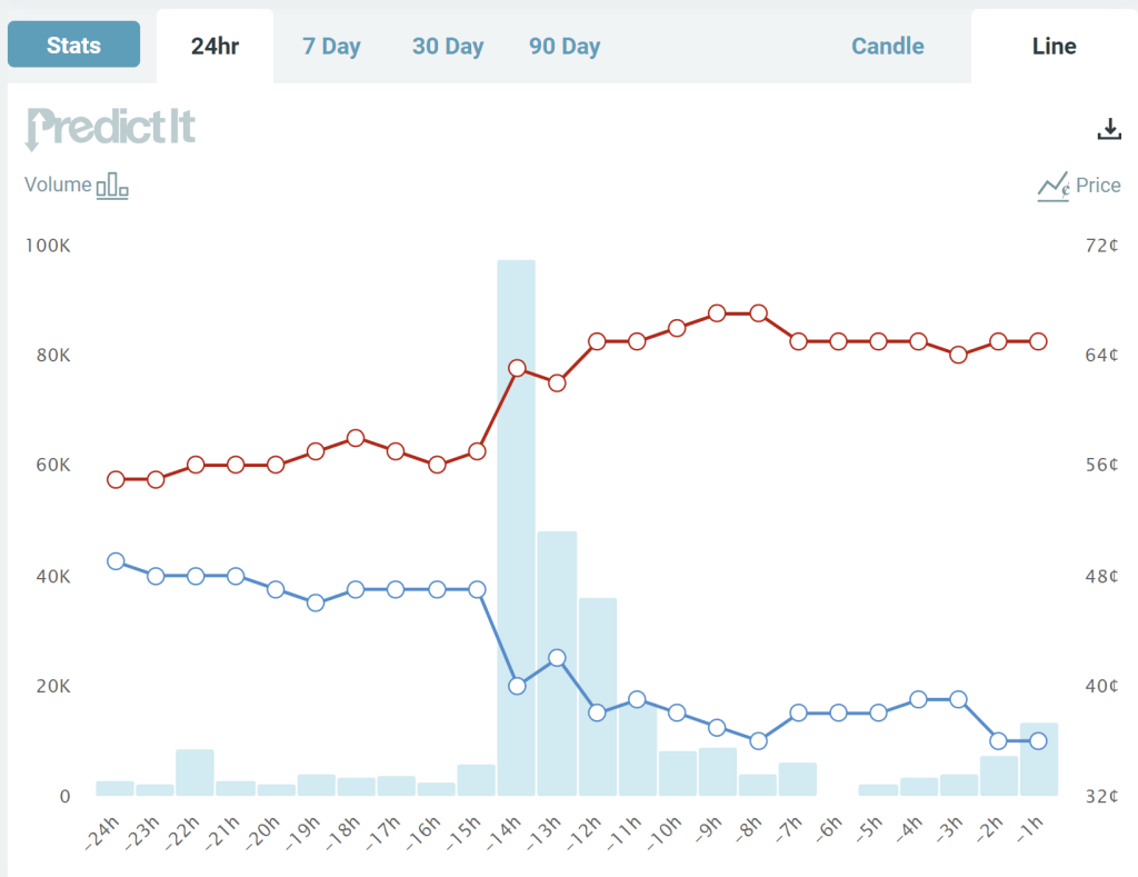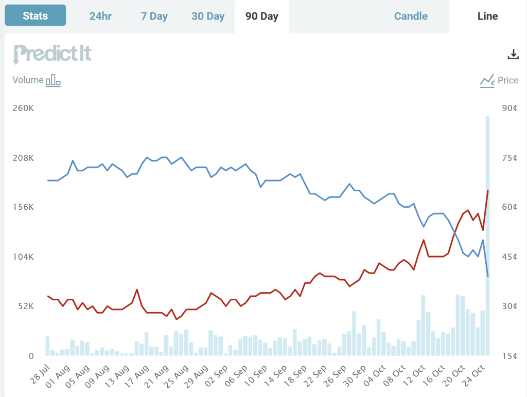 Notice though the big jump last night during the debate. The Republican candidate moved up from odds of about 57% to odds of about 63%, close to where it stands as I write (67%). Based on this result, it’s safe to say that the Republican candidate “won” the debate, though not so decisively that the election is now a foregone conclusion. You don’t need to wait for the polls, which have consistently showed the Democratic candidate in the lead (though with the gap closing in recent weeks) — though of course, these betting odds could change as new polling data is released.