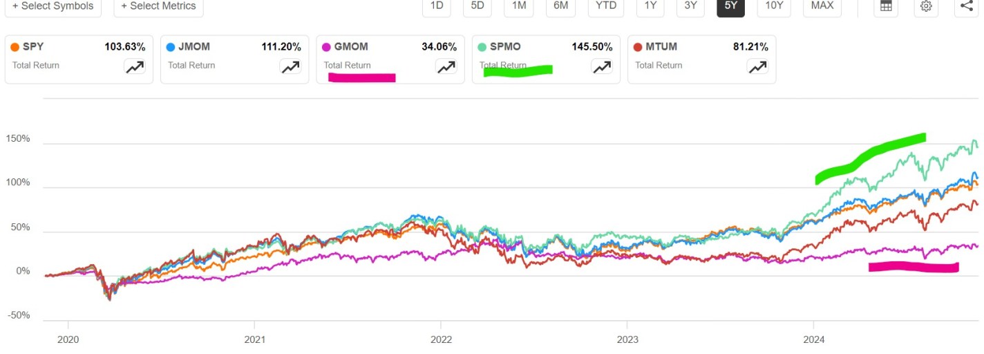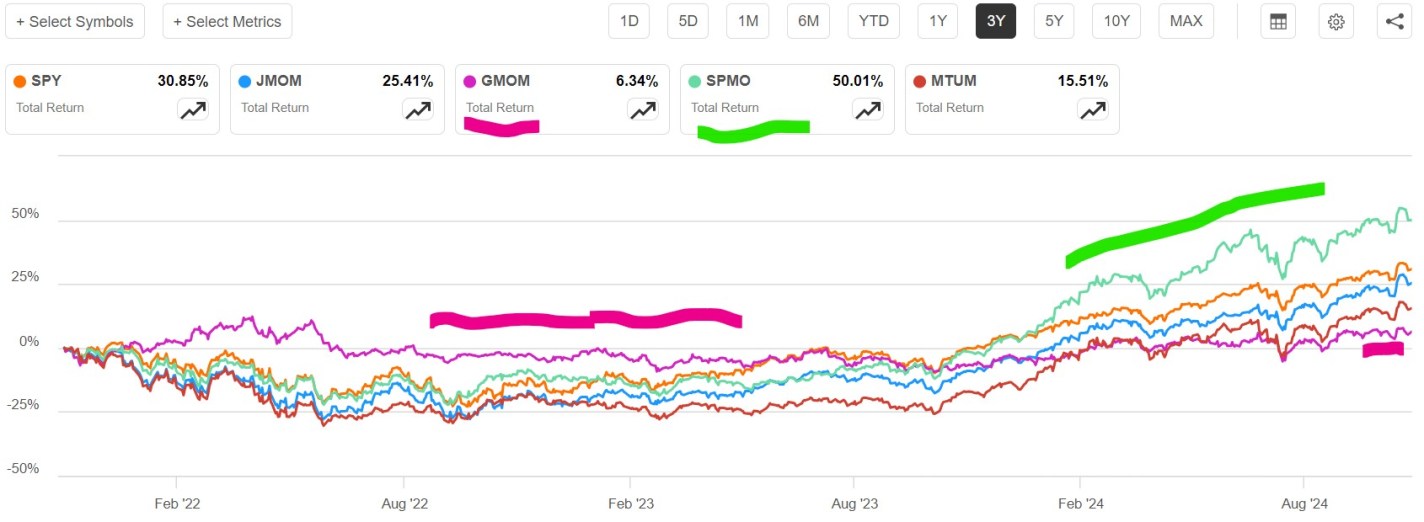 By not focusing on U.S. large cap stocks, the diversified GMOM (marked with purple highlighter line) is less volatile. Its price did not drop nearly as much as the other funds in 2022, but it missed out on the great 2023-2024 stock run-up. SPMO (marked with green highlighter) really took off in that 2023-2024 big tech fiesta, by virtue of being concentrated in stocks like Nvidia, which went up roughly 10X in this timeframe. But this outperformance may be something of a one-off lucky strike. SPMO is still about the best of the momo funds, normally at least keeping up with SPY, but it does not consistently outperform it.