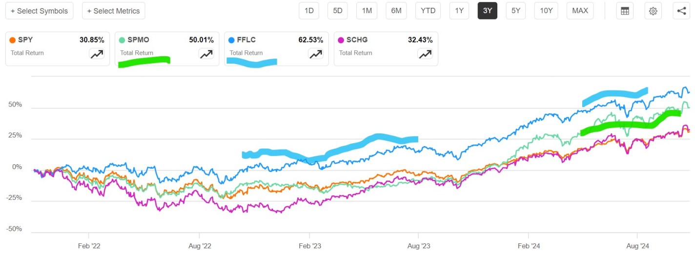 How does SPMO compare to a top actively-managed fund like FFLC or plain growth stock fund SCHG? The three-year plot below shows that FFLC (blue line, 63% total return) beat SPMO (green line, 50% return). Although SPMO had an impressive surge in the past year, FFLC just kept steadily outperforming SPY over the whole three-year period. This suggests that having good human judgement at the helm, able to adapt to differing market environments (2022 bear vs. 2023-2024 tech bull) can do better than a single, focused algorithm. I prefer a fund which keeps steadily outperforming “the market” (i.e., S&P 500) rather than one which only occasionally has moments of glory, so I hold more FFLC than SPMO.