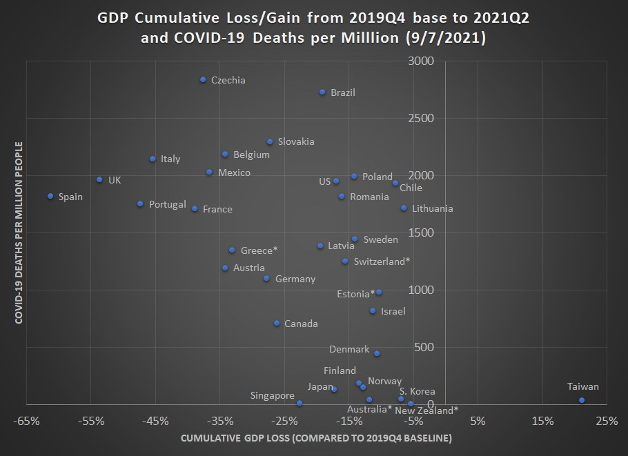 Back in March of this year, I wrote blog posts providing data on GDP losses and COVID-19 deaths for 2020, both for selected countries and US states. Since we’ve now had another 6 months of GDP data and the pandemic continues to take lives, I thought it would be useful to update that data.