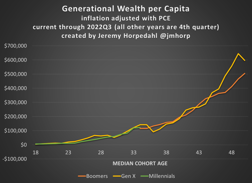 I’ve covered the topic of generational wealth before, and here’s the latest data on how each generation was doing at roughly the same age. The data is updated through the 3rd quarter of 2022.