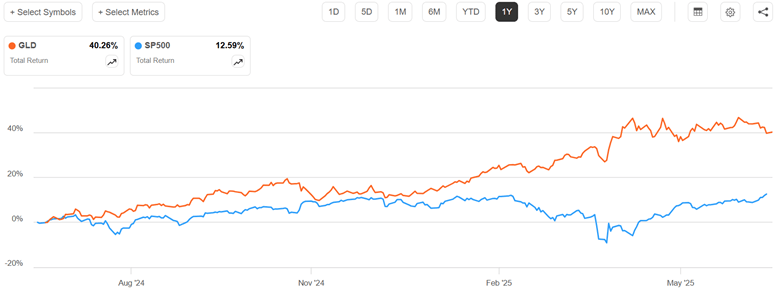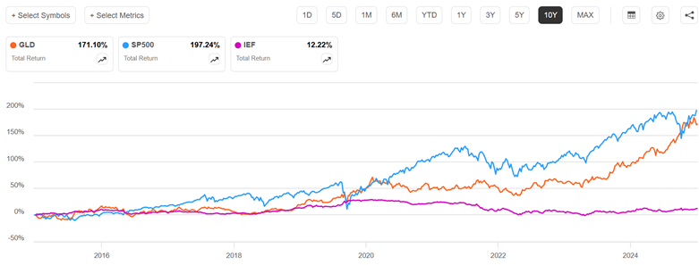 Here is how gold (using GLD fund as a proxy) has fared versus stocks (S&P 500 index) and intermediate term U. S. T-bonds (IEF fund) in the past year: