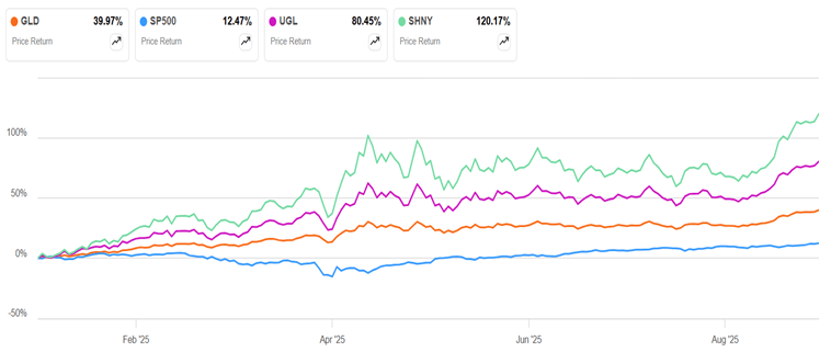 Holy derivatives, Batman, that leverage really works! With GLD (1X gold) up 40%, UGL was up 80% year to date, and 3X SHNY is up 120%. So, your $10,000 would have turned into $24,000. The mighty S&P500 (blue line) looks rather pitiful in comparison.