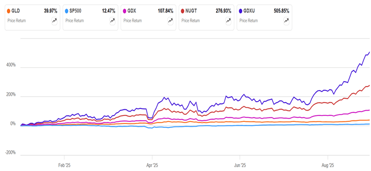 GDX is a large fund of representative mining stocks. For icing on the cake, there are funds that are 2X (NUGT) or 3X (GDXU) leveraged to the price changes in mining stocks. The final chart here displays their year-to-date performance in all their glory: