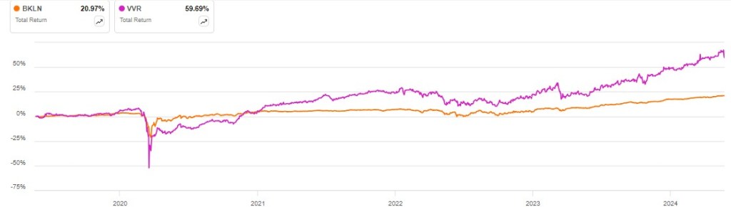 Here is another rough example of the power of leverage. The unleveraged fund BKLN holds bank loans, and so does the closed end fund VVR. But VVR borrows money to add to the shareholders’ equity. There is more complication (discount to net asset value) with VVR which we will not go into, but the following 5-year chart of total returns (share price plus reinvested dividends) shows nearly triple the return for VVR, albeit with higher volatility:
