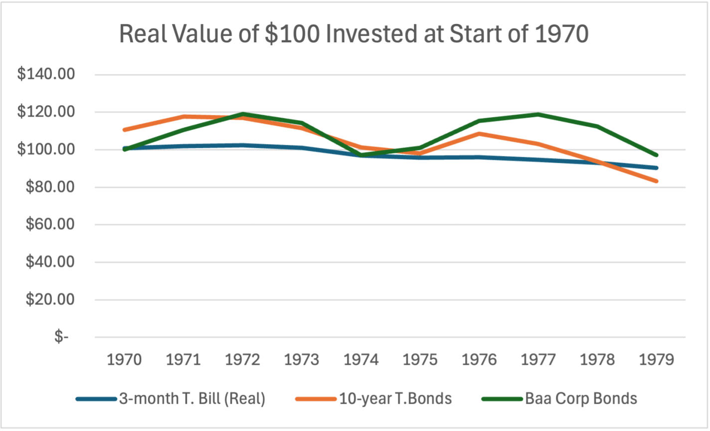 That’s how I concluded last week. So this week I’ll answer the question- what were the best investments of the 1970’s? When the dollar is losing value both at home and abroad, holding dollars or bonds that pay off in dollars does poorly: