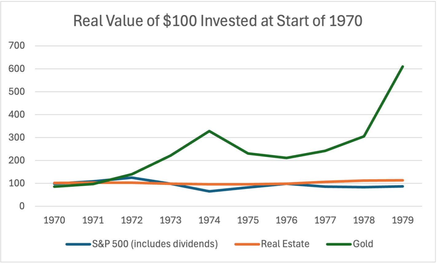 Stocks can do alright with moderate inflation, but US stocks lost value in the stagflation of the 1970’s. Foreign stocks and commodities generally performed better. Real estate held its value but didn’t produce significant returns; gold shone as the star of the decade:
