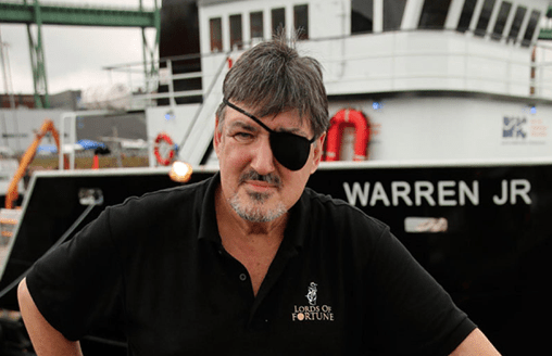 Bayerle looks like a pirate, sporting a genuine eyepatch covering an eye lost in an explosives accident. He killed a man who was fooling around with his wife, which seems like a piratical thing to do, and he is after a ship’s gold. His salvage enterprise is even formally described in legal court papers as “modern day pirates”.
