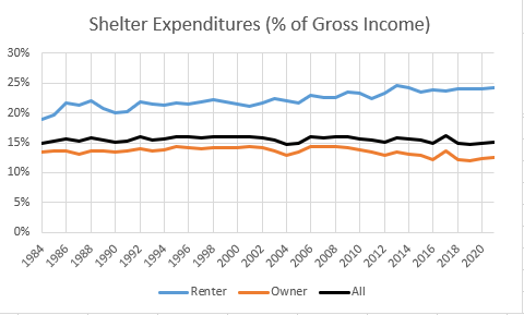 Be sure to read Erdmann’s post in full (he says many smart and correct things), but the key result is in his Figure 2 (reproduced here). Renters have seen the share of their income spent on shelter rise from 19% in 1984 to 24% in 2021. This is not a trivial increase. Owners, by contrast, have seen their share of spending fall, which is how it all gets washed out in the average.