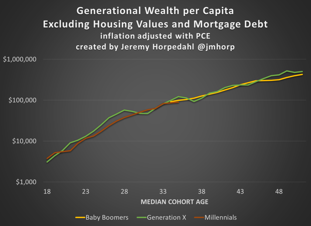 Given how much wealth can fluctuate based on housing values (see above for Gen X from 2007-2009), it might be useful to look at the data with housing. Housing is also a weird kind of wealth — for the most part, you can’t access it without selling (other than certain home equity loans), and when you do sell, unless your home appreciated more than average, you just have to move to another home that also appreciated.