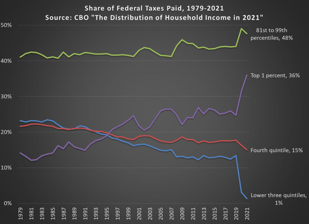 In 2021 the top 1 percent of taxpayers in the United States paid 36 percent of all federal taxes (they have 21.1 percent of income). This figure had been below 20 percent until the mid-1990s, and as recently as 2019 it was just 24.7 percent (they had 15.9 percent of the income that year).