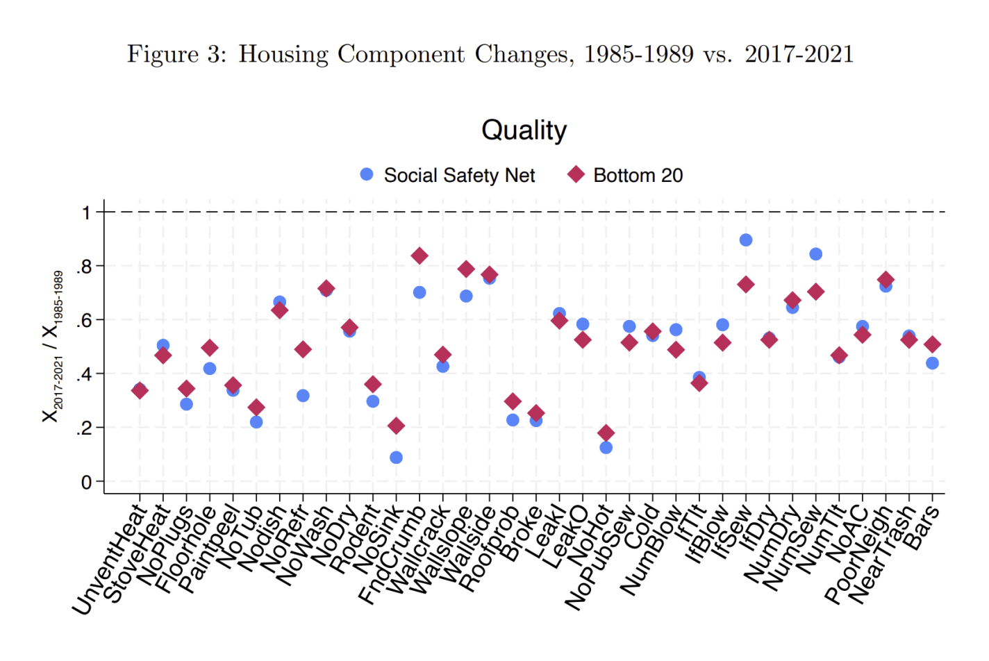 For example, the number of households with no hot water was just 20% of what it was in the late 1980s. Some of the other major improvements are also related to plumbing and water, such as the number having no kitchen sink or no private bathtub/shower, but there was also a big decline in the presence of rodents in the house. All of the 35 indicators they looked at showed improvements, on average a 50% reduction in the number of households with these poor-quality components. This paper only uses data back to 1985, but almost certainly there would be even larger improvements if we used 1971 as the starting point.