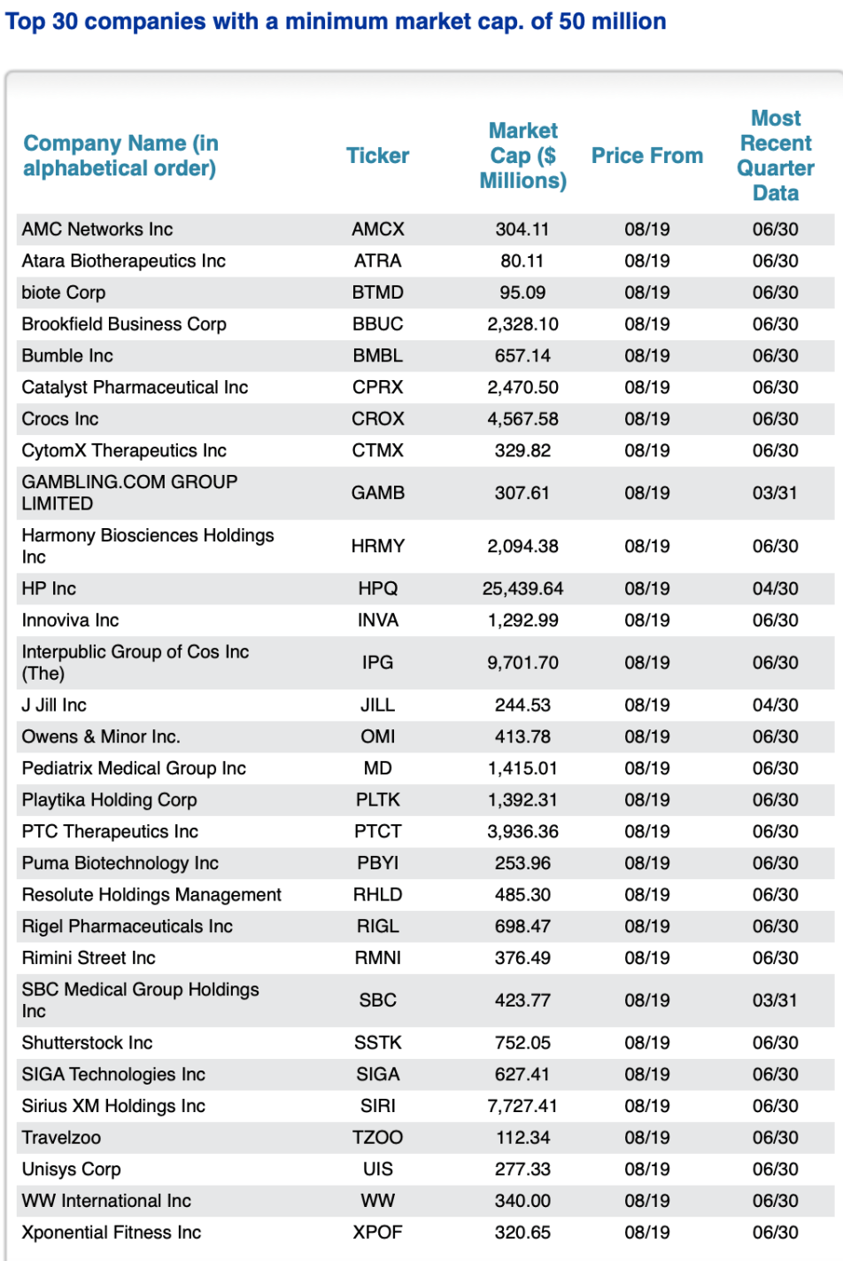 How has it done since? He still maintains the website, https://www.magicformulainvesting.com, that gives updated stock screens to implement his formula, which is nice. But the site doesn’t offer updated performance data, and his company (Gotham Capital) offers no ETF to implement the book’s strategy for you despite offering 3 other ETFs, which suggests that Greenblatt has lost confidence in the strategy. Here are the top current top stocks according to his site (using the default minimum market cap):