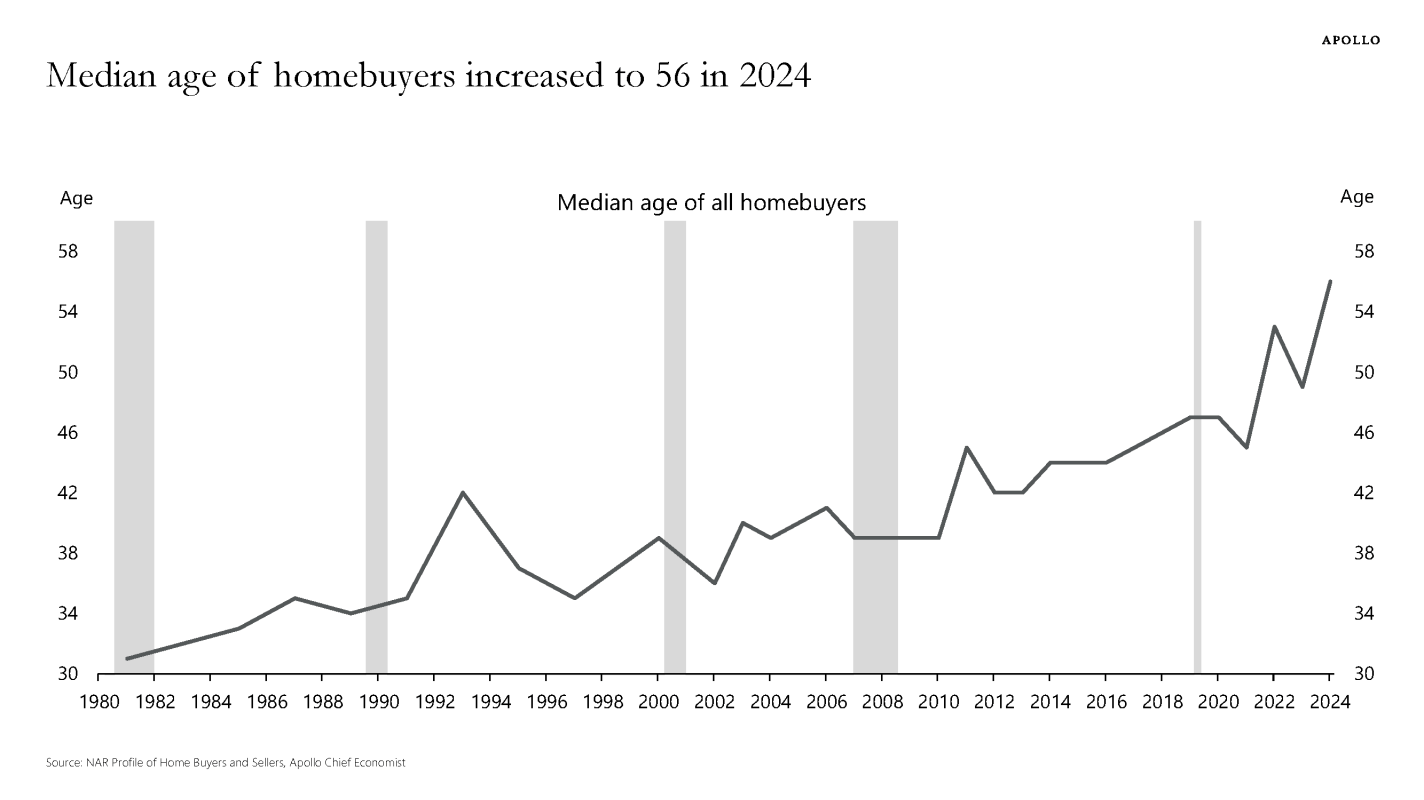 2. It’s About Housing: House prices are at all time highs (far above the prices during the 2000s “bubble”). Mortgage rates remain high, and to the extent that Fed rate cuts push them down, they will likely push prices higher, leaving homes hard to afford. High credit standards post-Dodd-Frank mean younger buyers in particular find it hard to get a mortgage; homeownership rates are falling while the average age of homeowners shoots upward. Most older people already own a house, while most young people want to buy but see that as increasingly out of reach.