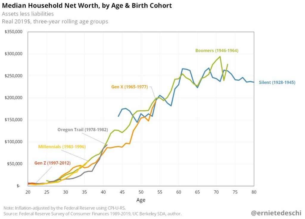Looking at household net worth at roughly the same age, Millennials today have roughly the same household wealth as Boomers did in the past. And both of these generations beat the generation between them, Gen X, as well as the “microgeneration” creatively labeled Oregon Trail.