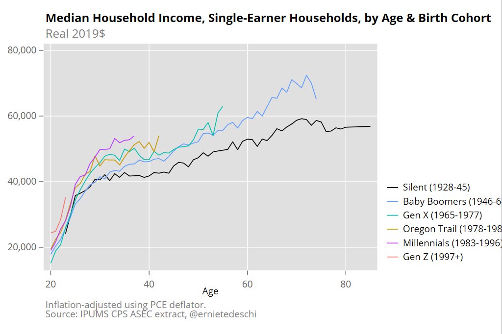Part of this may be driven by the increase in dual-income households. Certainly that matters. While wealth data by number of earners is harder to track down, income data is more readily available. What if we look at single-income households? Millennials are still in the lead! (Once again, the chart comes from Ernie Tedeschi.)