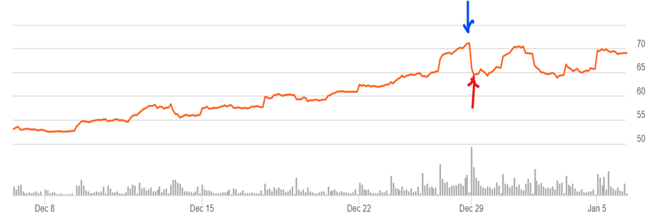 Silver prices were rising rapidly throughout the month, but then really popped during Christmas week, reaching a crescendo on Friday, Dec 26 (blue arrow), amid rumors of physical shortages on the Shanghai exchange. To cool the speculative mania, the COMEX abruptly raised the margin requirements on silver contracts by some 30%, from $25,000 to $32,500, effective Monday, Dec 29. I think the exchange was trying to ensure that speculators could make good on their commitment, and the raise in margin requirement would help do that. (Note, the exchange is liable if some market participant fails to deliver as promised and goes BK).