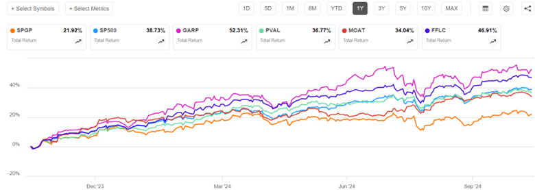 Over the past one year, GARP (52% return) soared way above S&P 500 (blue line, 39%), but with high volatility, consistent with its heavy growth/tech exposure. FFLC steadily pulled ahead of SP500 over the past twelve months, racking up a 47% return. PVAL and MOAT finished close to SP500, while tech-poor SPGP flat-lined in the most recent six months and so got left far behind.