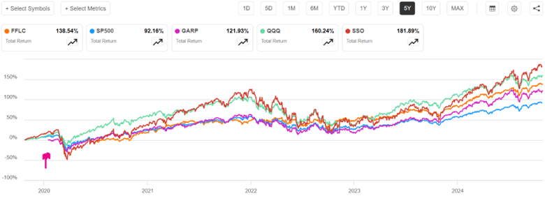 I am motivated to include some FFLC (for overall consistent good performance) and PVAL (for a bit of crash protection) in my holdings. But I recognize that their performance could deteriorate in the future, if their investing style no longer works in some new market regime. SPGP is a cautionary example, going from rock star in 2021-2022 to awful in 2024. Even FFLC had an unfavorable first year of operation. The tech giants that dominate QQQ continue to also dominate earnings growth, so QQQ may continue to outpace SP500.