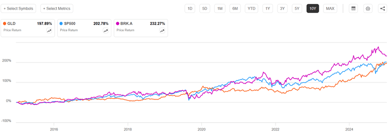Over most of this time period (through 7/21/2025), BRK.A and SP500 were pretty close, and gold lagged significantly. Gold was notably left behind during the key stock surge of 2021. Even with the rise in gold and dip in BRK.A this year, Buffett’s company (up 232%) still beats gold (198%) over the past ten years. BRK.A pulled well ahead of SP500 during the 2022 correction, and never gave back that lead. In the April stock market panic this year, BRK.A actually went up as everything else dropped, as it was seen as a tariff-proof safe haven. SP500 was ahead of gold for nearly all this period, until the crash in stocks and the surge in gold in the first half of 2025 brought them to essentially a tie for the past decade.