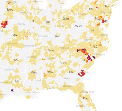 The chart above is for the whole country. It turns out that these cases are highly localized in certain hot spots, especially along the Atlantic seaboard (Delaware through South Carolina), plus the region of St. Joseph, Missouri: