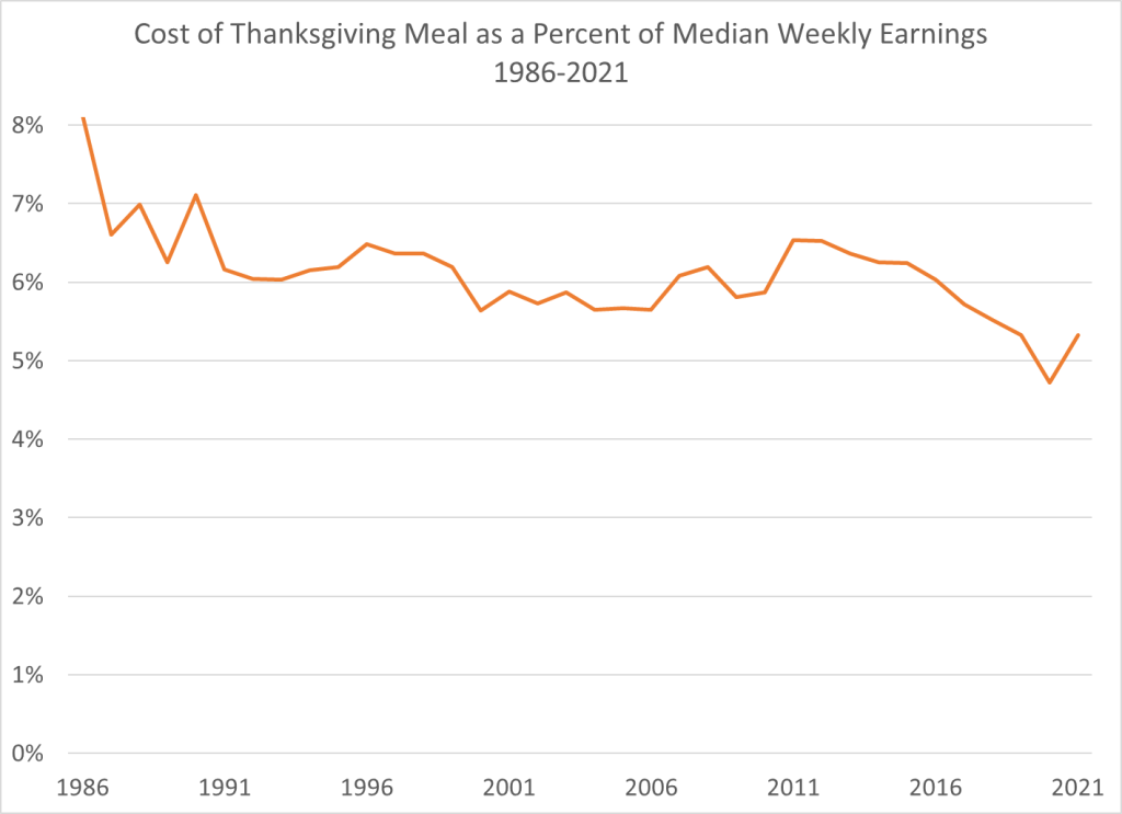 We should ask the same question in the United States today: how do incomes today compare to incomes in the past? Which measure of income you use is important, but if we use median usual weekly earnings of full-time workers, we can make a simple comparison of how much of your weekly earnings would be needed to buy a traditional Thanksgiving meal. This chart shows exactly that. In 2021 that meal will be the second lowest it has ever been as a percent of median earnings — higher than last year, but tied with 2019 for the second lowest. And much less than in the late 1980s and early 1990s (I use third quarter data for each year, the most recent available).