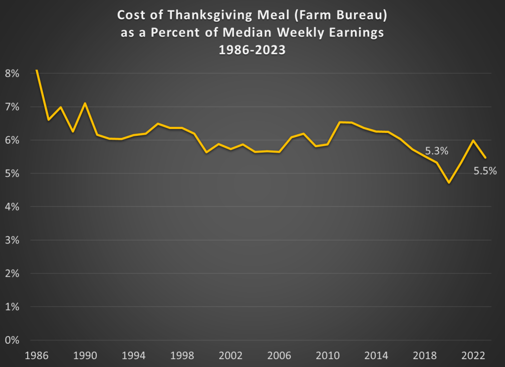 The Farm Bureau turkey dinner stands at about 5.5 percent of median weekly earnings from the third quarter of this year. That’s a touch higher than 2019, when it was 5.3 percent of weekly earnings. But notice that other than 2019, the figure for 2023 is the lowest ever! (Ignoring the weird years of the pandemic, when wage data is hard to interpret.) So we haven’t quite gotten back to 2019 levels, but we are at the same level as 2018. And lower than 2017. And all prior years too.