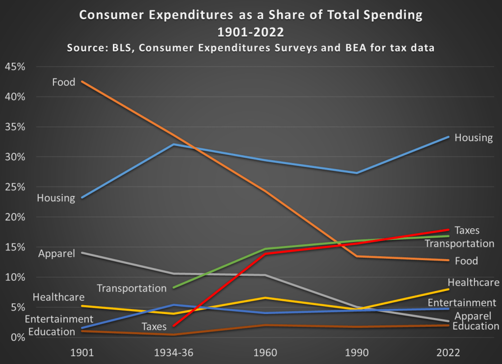 Most of the data in this chart comes from the BLS Consumer Expenditure Surveys. This survey was done occasionally since 1901, and then annually since 1984. I also use BEA data to estimate personal taxes paid as a percent of spending (the CEX Surveys have some tax data, but it’s not reliable nor consistent). I picked as close to 30-year intervals as I could (with a preference for showing the earliest and latest years available), and I chose spending categories that are 90-100% of total expenditures in most of these years. Keep in mind also that these are consumer expenditures. As a nation, we spend a lot more on healthcare and education than this chart suggests, but most of that spending is not directly from households (of course, it is indirectly). Think of this chart as an average household budget.