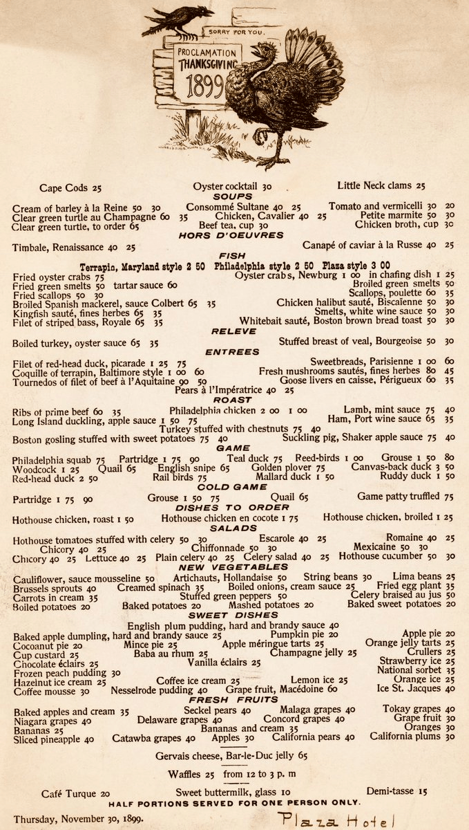 When you see prices from the past, especially the distant past, your normal reaction is perhaps one of envy or nostalgia. Take for example the Thanksgiving menu from the Plaza Hotel in New York in 1899. As you browse the menu, note that the prices are in cents, not dollars.