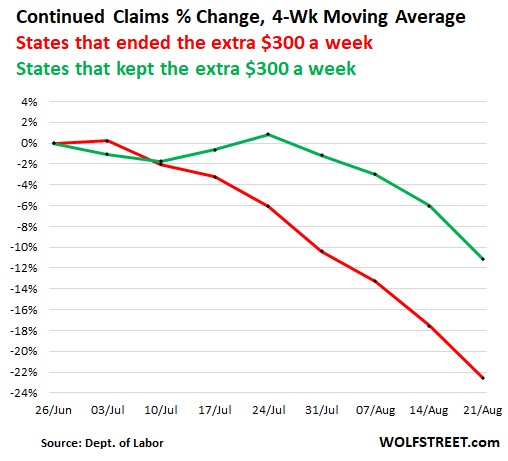 Wolf Richter has compiled some numbers on unemployment insurance (UI) claims by state, reported weekly by the Department of Labor. A data point of “continued claims” reflects the number of people that have claimed UI for at least one week. A drop in continued claims would indicate that they have started working again. He lumped the states into two groups, “Enders” who terminated the extra unemployment benefits, and “Keepers” who retained them. Here are the results through the end of August: