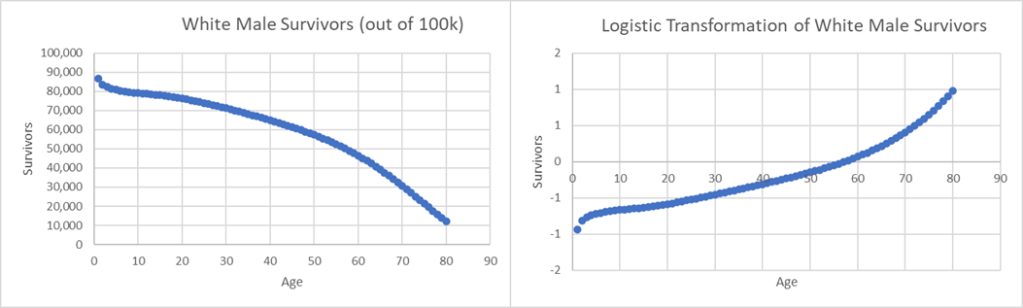 Another cool thing is that survival rates between the ages of one and eighty can dependably transformed to follow a logistic function.* See below the survival rates for white US males.